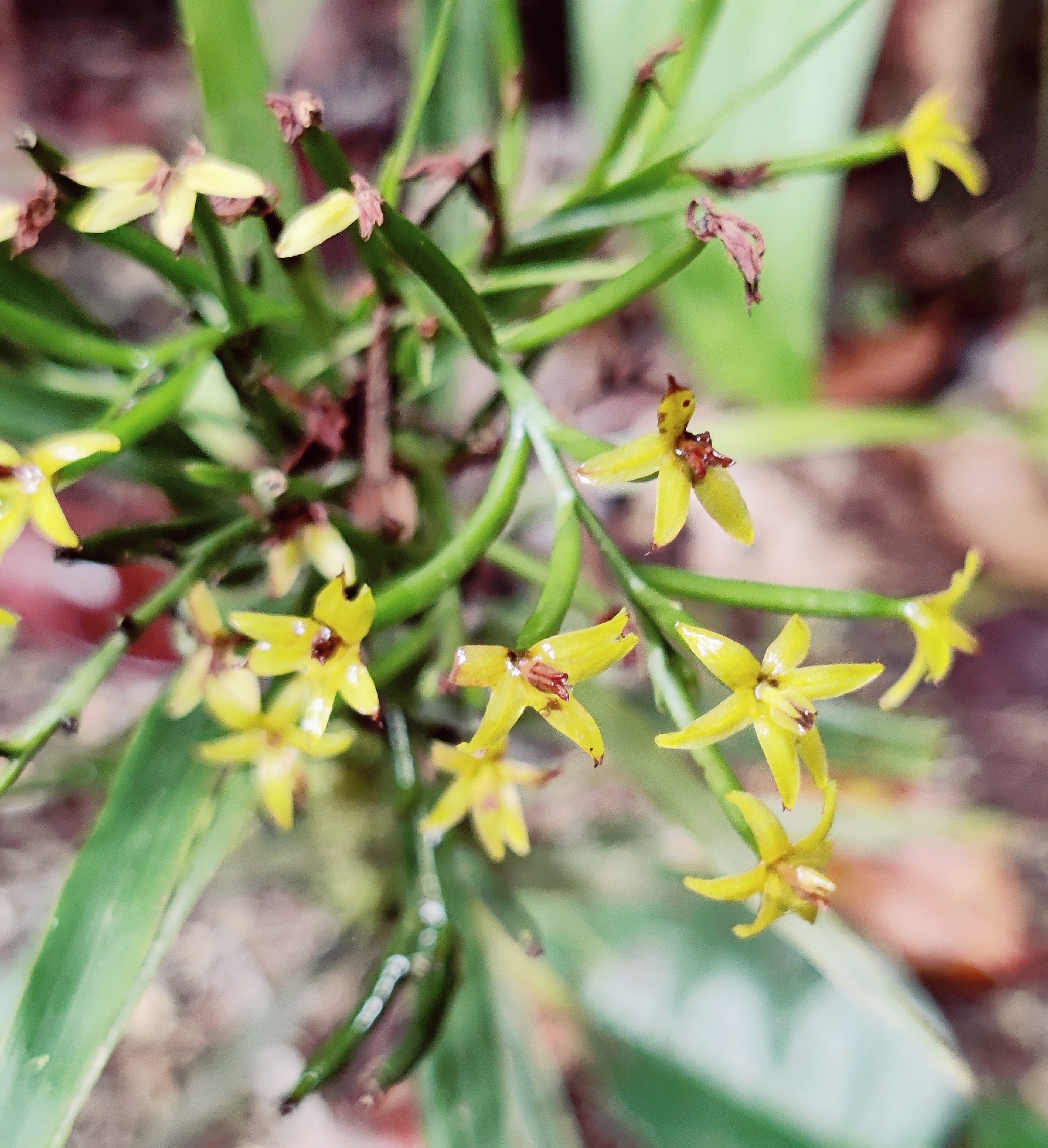 vielblütig; Blütenhüllblätter lanzettlich, 3-4 mm. Blüten 0,7-1 cm im Durchmesser; Blütenstiel und Fruchtknoten 13-18 mm. Kelchblätter gelb, linealisch bis schmal länglich-lanzettlich, 4-6 × ca. 1,2 mm, 3-5-geädert, Spitze gekerbt. Blütenblätter ähnlich wie Kelchblätter, gelb; Lippe ähnlich wie die Blütenblätter, aber gewöhnlich etwas breiter. Säule fehlend