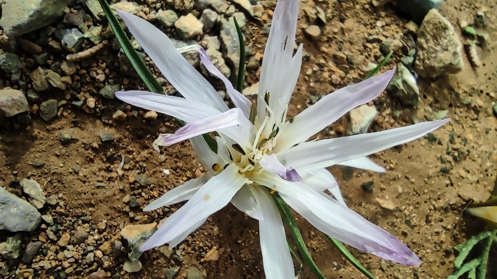Blätter: Bis zu 17 cm x 3–5(–8) mm, erscheinen zusammen mit den Blüten; Rand rau.Blüten: (1–)2–3(–5). Lappen der Perigon-Segmente: (12–)15–25(–45) x 2–4 mm, stumpf, an der Basis erweitert. Staubbeutel: 1,5–3 mm, etwa halb so lang wie die Staubfäden, violett, rückseitig befestigt, beweglich.Kapsel: 12–20 mm, länglich, kurz gestielt, mit langanhaltenden Griffeln und Klauen der Perigon-Segmente. Samen: 2–2,2 x 1,6–1,8 mm, länglich, mit einem mehr oder weniger dreieckigen Schnabel.Blütezeit: Herbst.