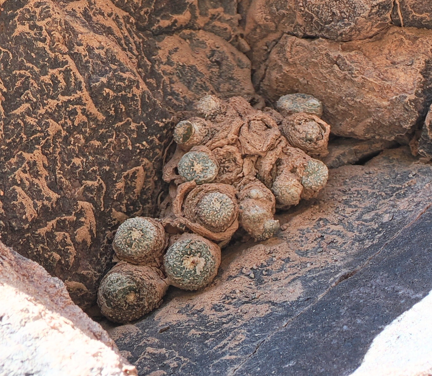 Stengel bzw. Stamm: Winzige flache Körper zu Anfang, mit langen Rübenwurzeln, dann Gruppen bildend; Epidermis graugrün; Einzelkörper in die sich allmählich verjüngende Wurzel übergehend; Rippen unterdrückt; Areolen filzig, spiralig angeordnet und zu einem Filzscheitel geschlossen, Epidermis kann auch fast silbergrau sein, in der Trockenzeit oft stark konkav eingesenkt, fast kraterförmig.