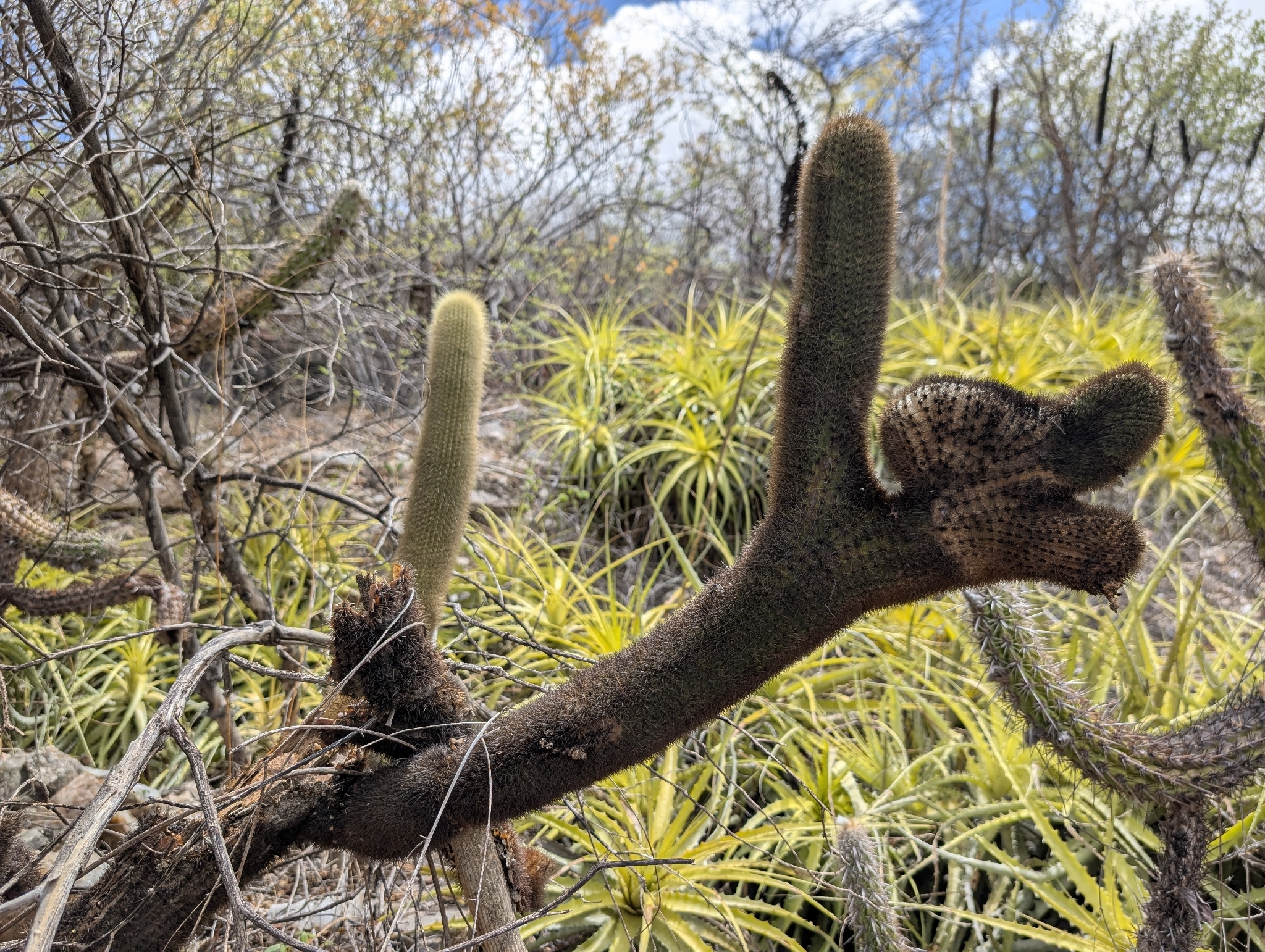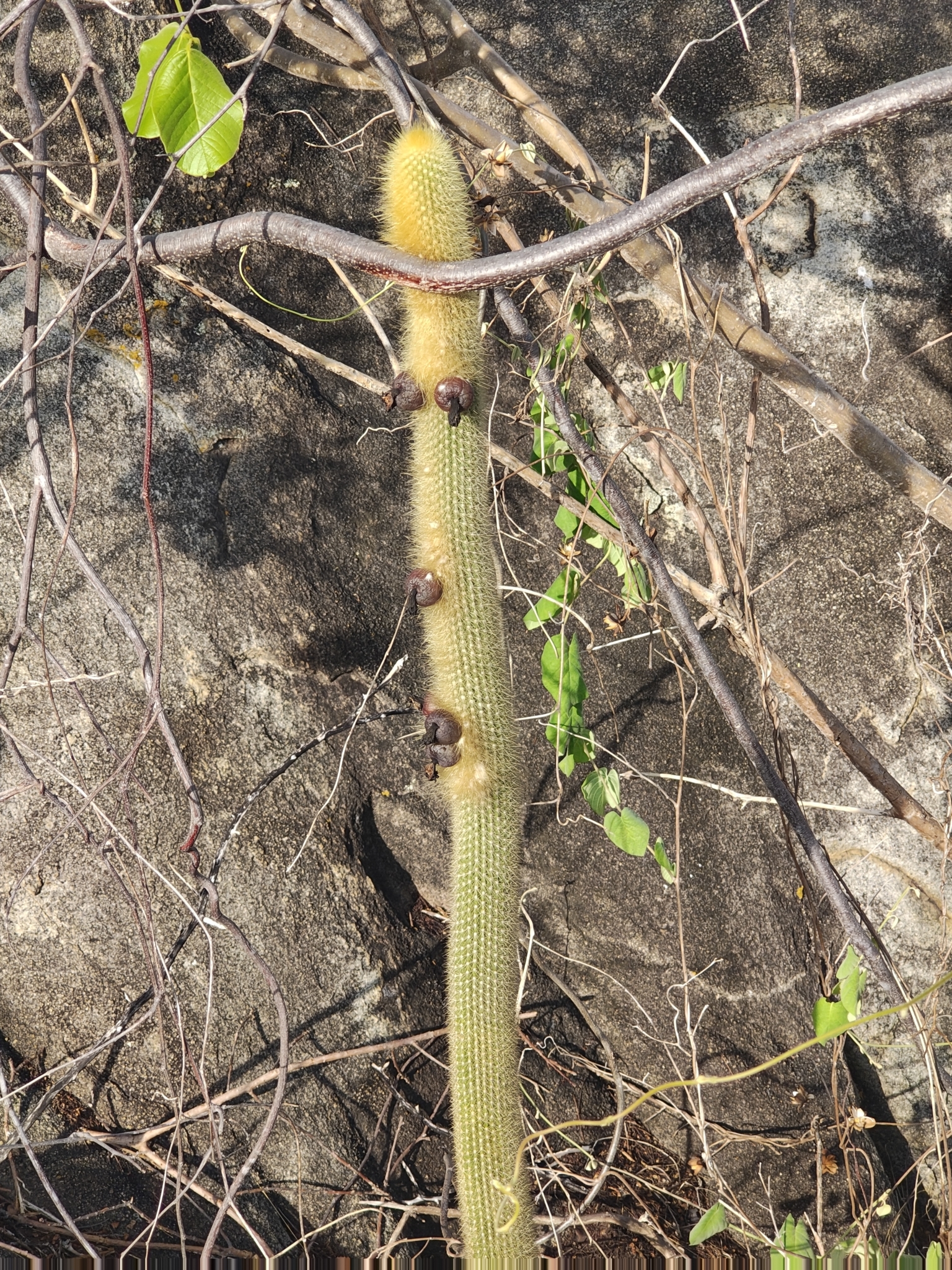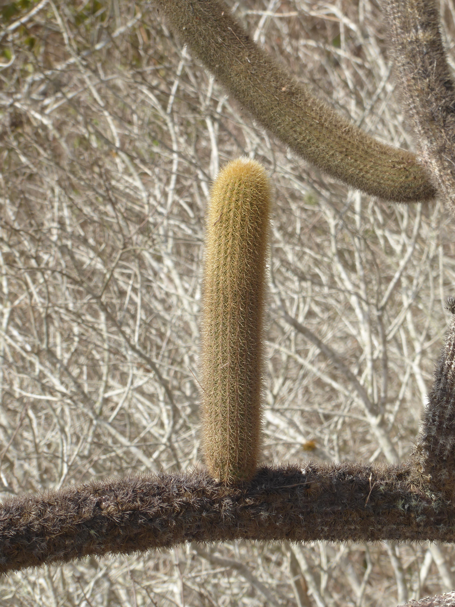 Stengel bzw. Stamm: Bis 5 m hoch, aufrecht, oft mit kurzem Stamm, am Grunde reich verzweigt; Triebe aufstrebend, frischgrün, bis 9 cm ∅; Scheitel von gelben Stacheln oder Borsten überragt; Rippen gerade herablaufend, 20—30, 6 mm hoch; Areolen dicht stehend, 5—8 mm entfernt, mit kurzem Wollfilz und einigen herabhängenden Haaren, 1—2 cm lang; Stacheln sehr zahlreich, ca. 30, nicht trennbar, goldgelb, später mehr bräunlich, feinnadelig, bis 2 cm lang; an Blütenzone der Westseite, ähnlich wie bei Seticereus, dichte und verlängerte, borstenartige St., bis 5 cm lang, goldgelb, die weiße Areolenwolle dichter und länger