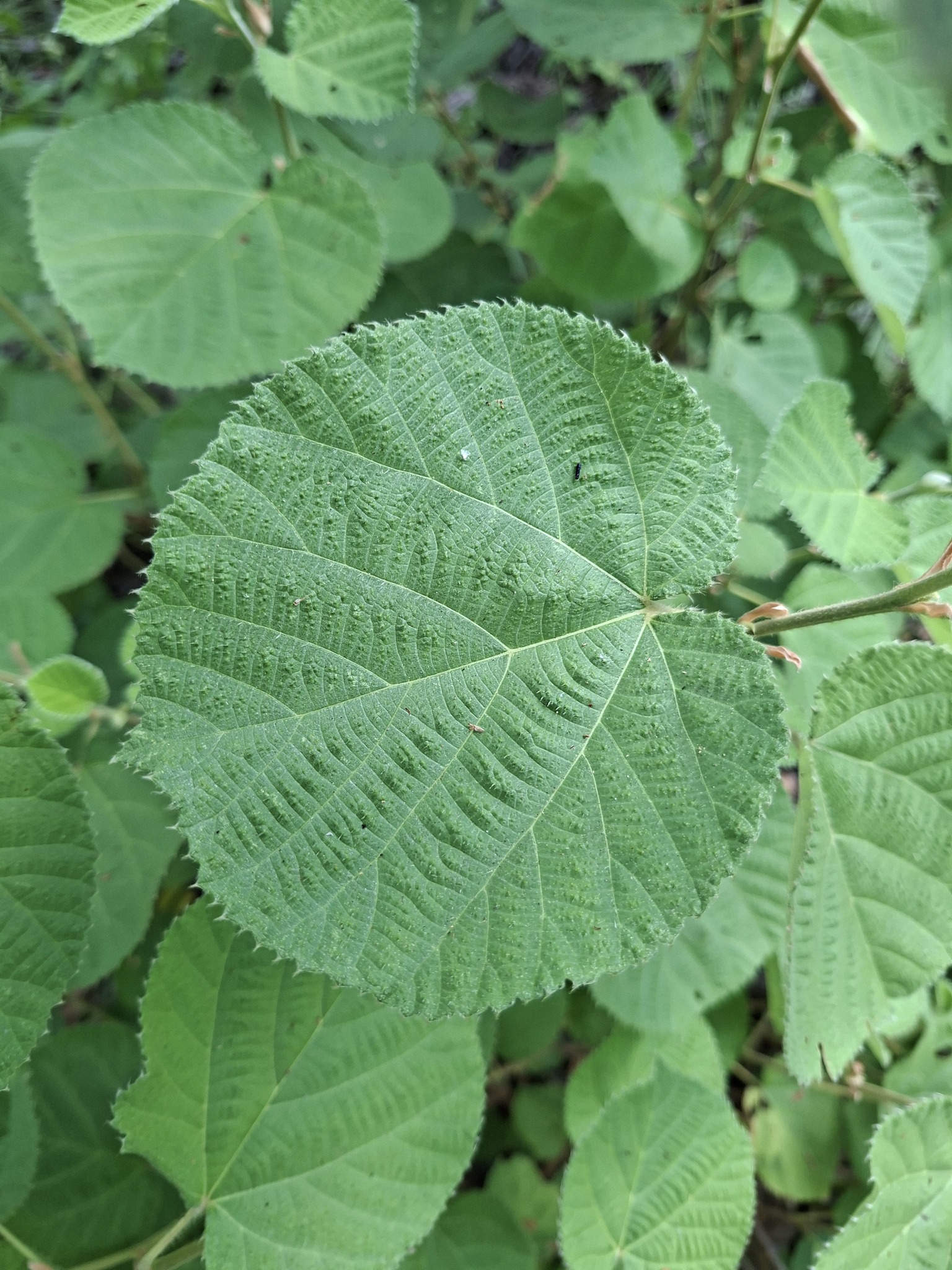 Blätter fast rund bis 12 cm Durchmesser, auf Stielen bis 4 cm; unten blasser und stärker behaart, 5 Adern deutlich sichtbar.