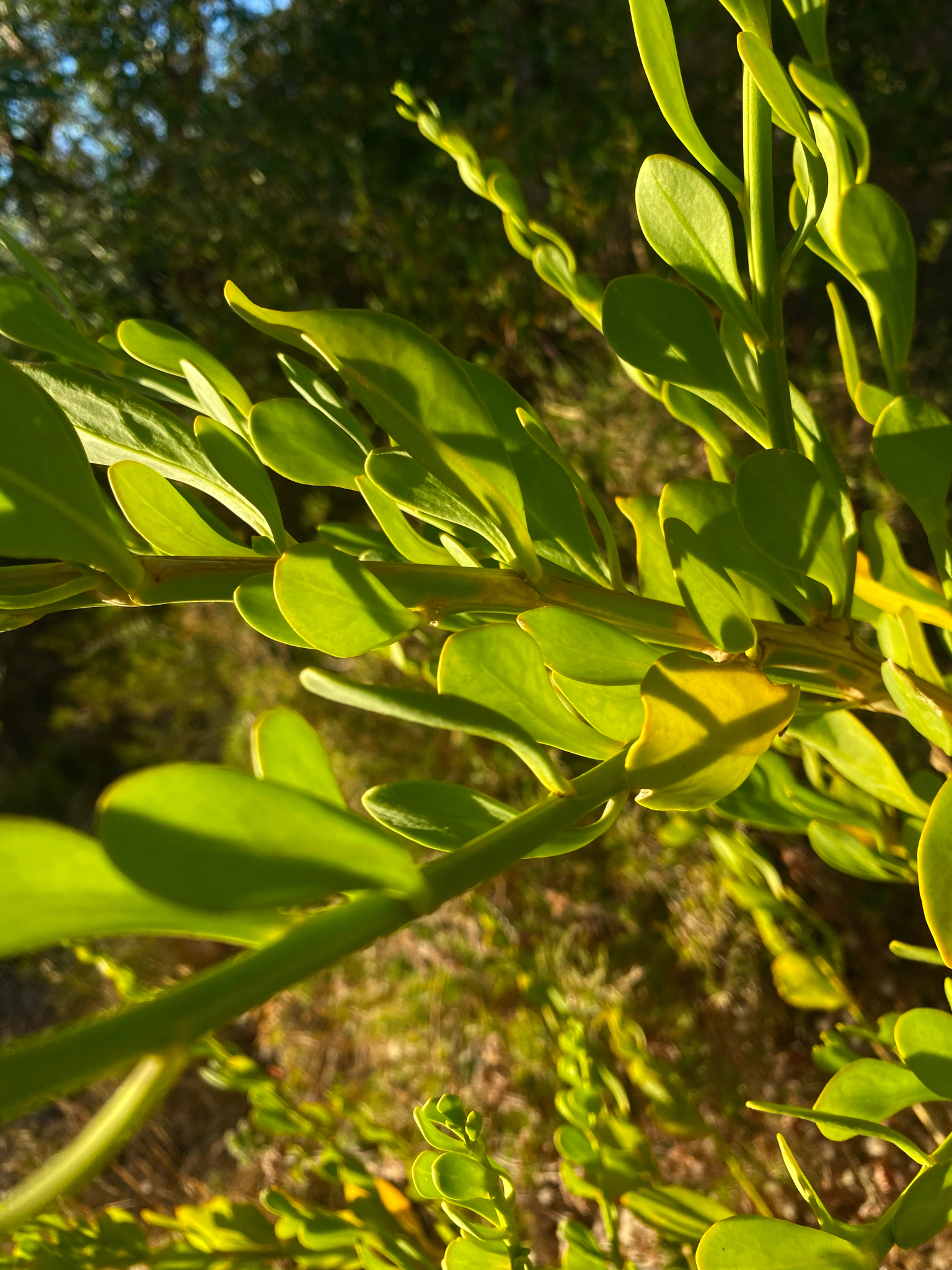 Wuchsform: Aufrechter, selten kriechender Strauch, bis zu 3 m hoch, stark verzweigt von der Basis aus. Die Zweige und Blätter sind kahl (glabrous). Sämlinge besitzen verstreute Stacheln am Stängel.