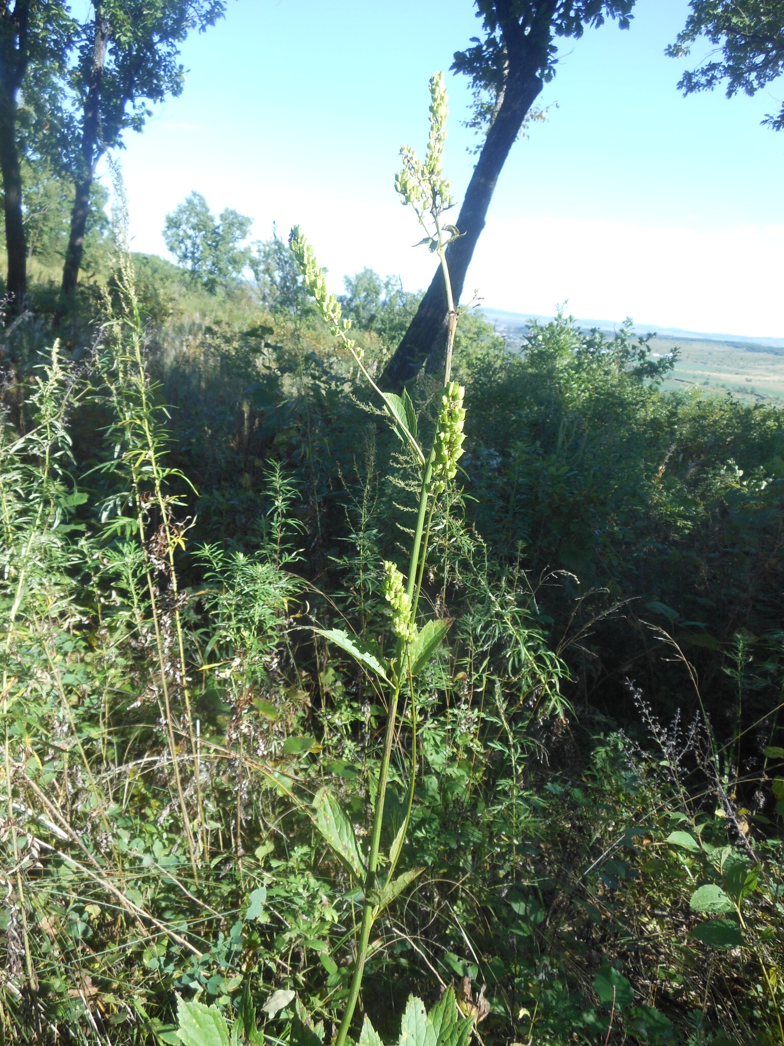 Mehrjährig; Wurzelstock dick, mehrköpfig; Stängel krautig, einjährig, bis zu 1 m hoch oder mehr, einzeln oder in Gruppen aus dem Wurzelstock wachsend, einfach, im unteren Teil gefurcht, kahl von der Basis bis zur Blütenstandszone. Untere Stängelblätter mit langen, an der Basis verbreiterten Blattstielen, doppelt dreizählig, mit lang gestielten Lappen; Blattlappen breit-eiförmig, zugespitzt, lederartig, unterseits hellgrün, die Ränder mit großen, zugespitzten Zähnen. Obere Stängelblätter: 1–3, kleiner, dreiteilig, kahl. Blütenstand: traubig, einfach, meist jedoch mit 2–8 kurzen Verzweigungen; diese und die Blütenstiele sind mit kurzen grauen Haaren bedeckt. Hochblätter: lineal, zugespitzt. Blüten: zwittrig; Kelchblätter: 4–5, kronblattartig, früh abfallend. Nektarblätter: weiß, ganzrandig, spatelförmig oben, enden in einem fast häutigen, ganzrandigen oder zweilappigen Anhängsel. Staubblätter: zahlreich. Fruchtblätter: mehrere, kahl, gestielt. Blütezeit: August.