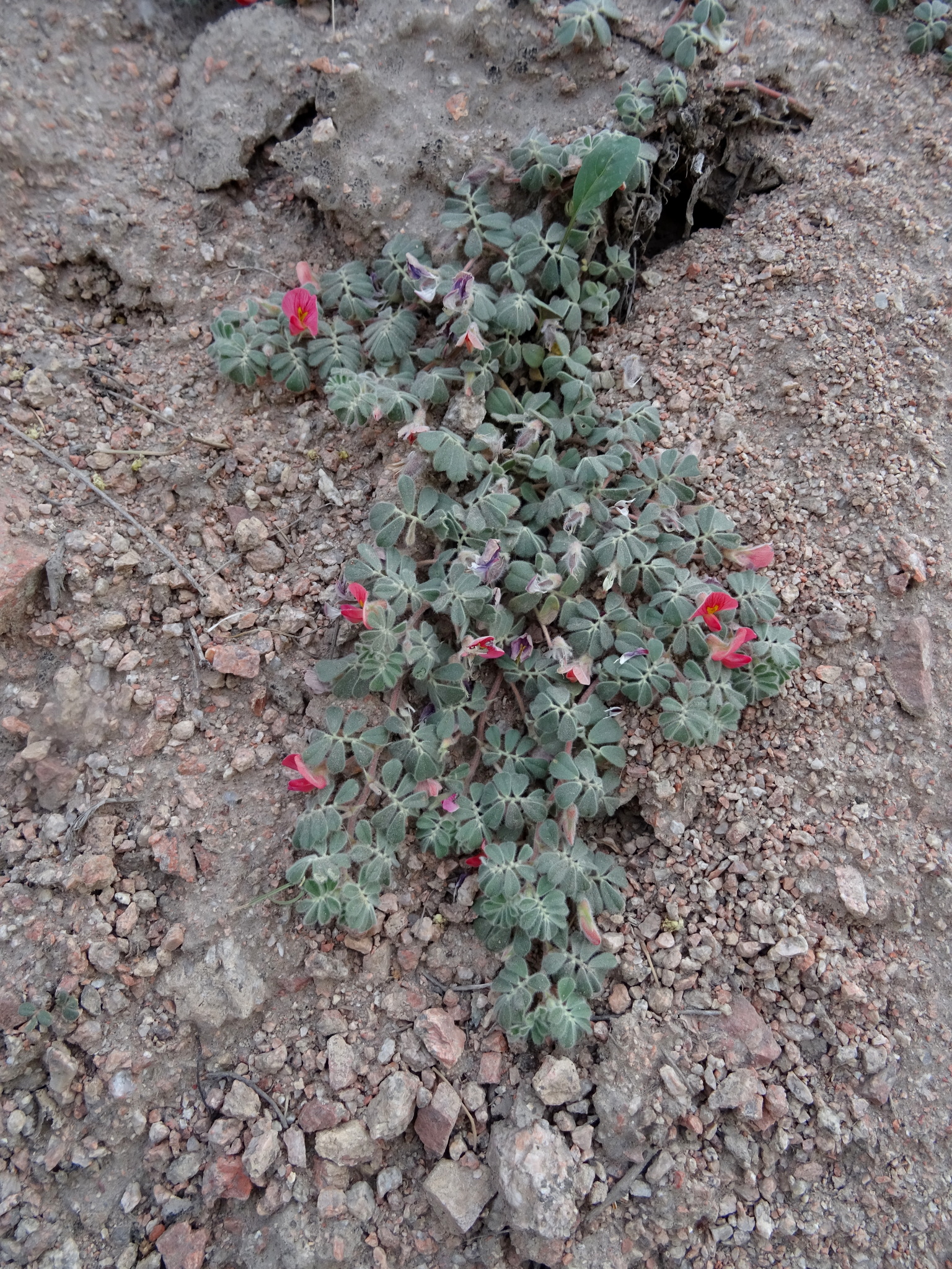 Staude mit einer kräftigen holzigen Pfahlwurzel und einer holzigen Krone, die in eine Anzahl langer, schlanker, schwacher, kriechender Triebe von 10—20 cm Länge geteilt ist, durchgehend dicht mit weichen, leicht abstehenden weißen Haaren bedeckt; Nebenblätter krautig, frei, kaum an der Basis mit dem Blattstiel verwachsen, dreieckig-eiförmig, lang zugespitzt, 2—3 mm lang;