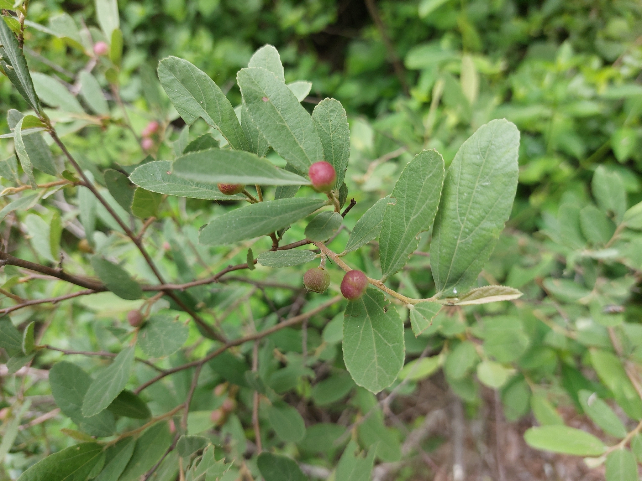 Blätter oval bis länglich, spitz, 1-9 cm, der Rand fein gezähnt, oberseits glänzend grün, unterseits blass grau-weiß unten, in der Hitze hängend.