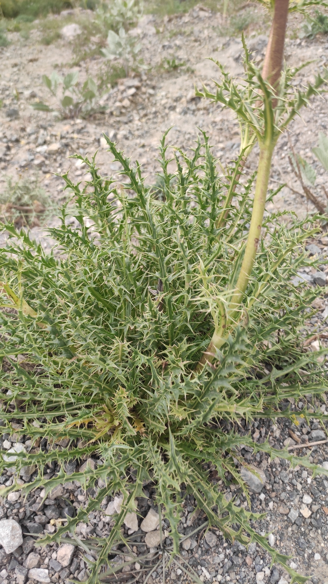 Blatt: Laubblätter 10-25, kahl, 10-20 (25) cm lang, 2 cm breit, steif korienförmig, fiederspaltig, 10-15 Lappen an jeder Seite, jeder mit 2-5 spitzen, steifen Dornen, Gliedmaßen spitz zulaufend verjüngt sich zu einem ziemlich breiten Blattstiel mit weicheren Randdornen; Laubblätter 2-spiralig, 5-6 Wirtel pro Blatt, ähnlich wie die Grundblätter, aber viel kürzer, sitzend und unbehaart.