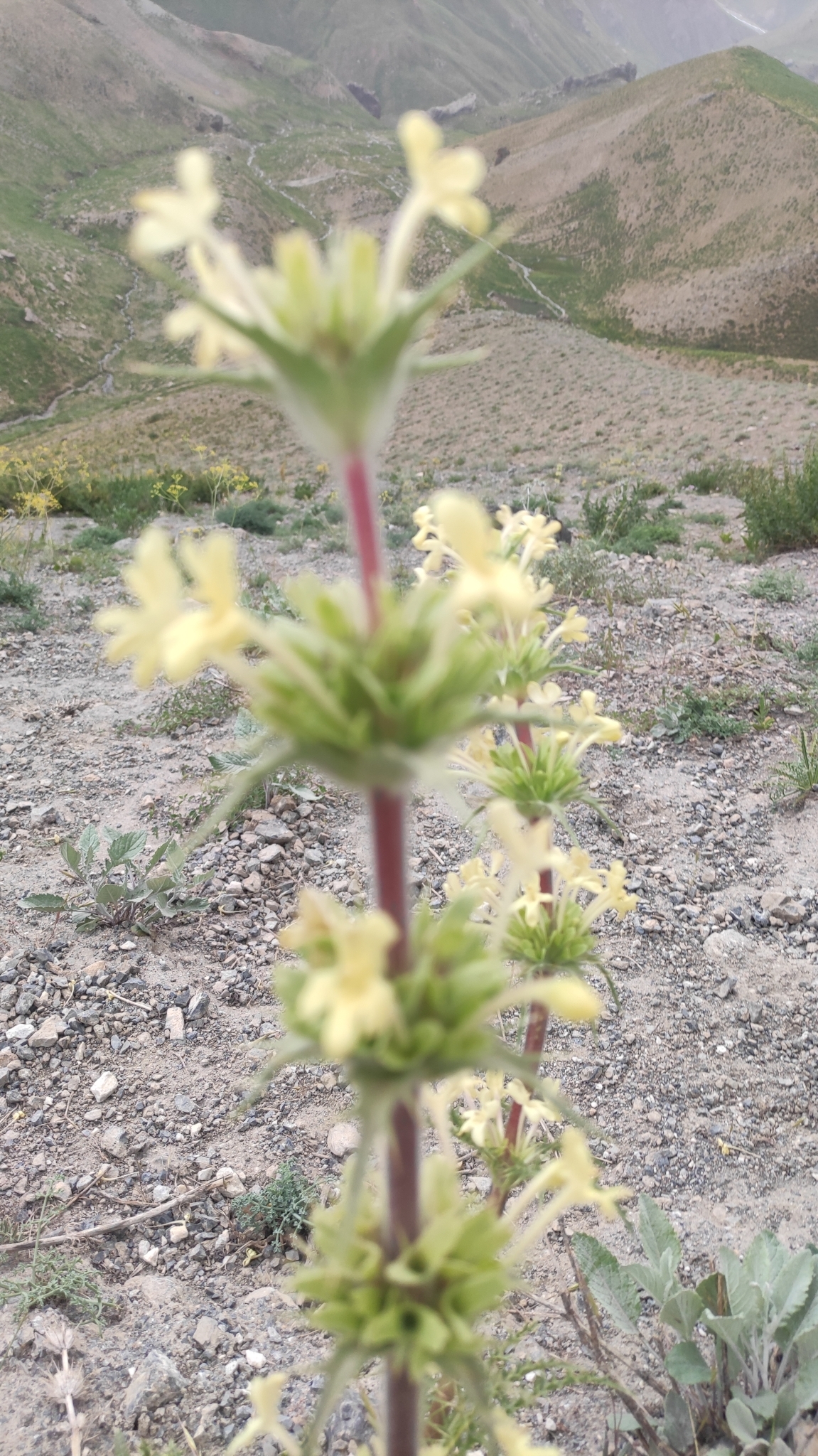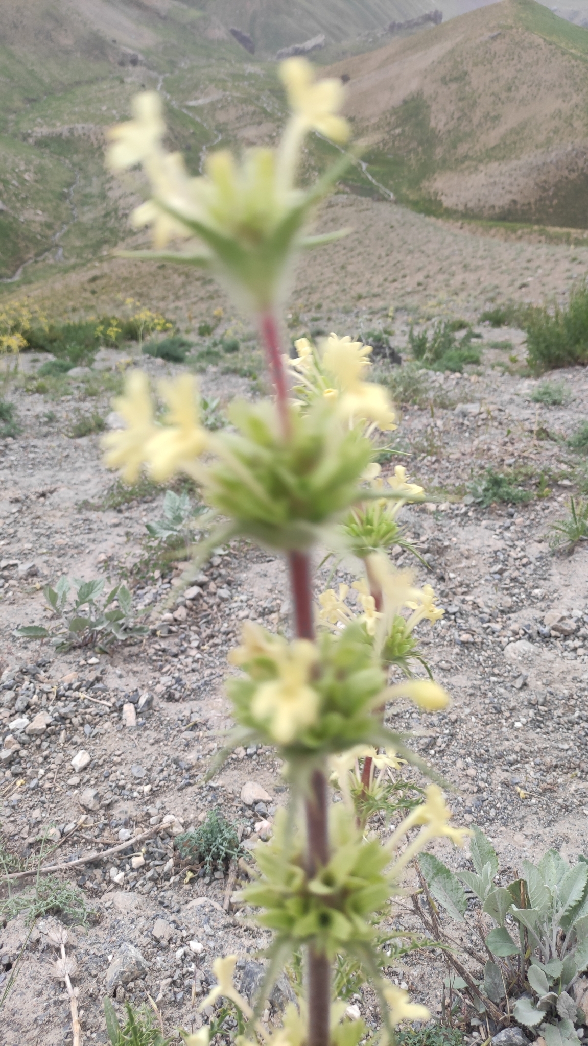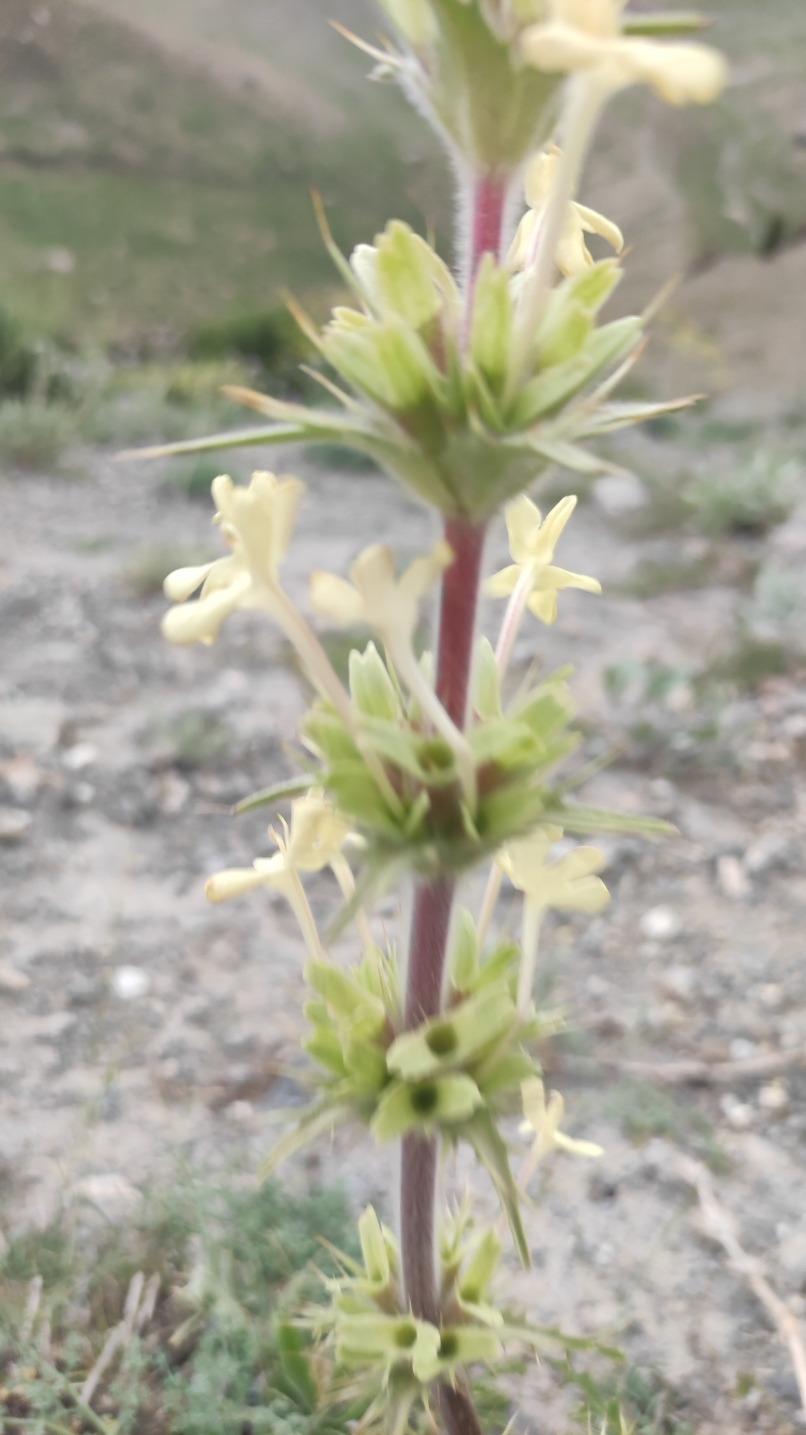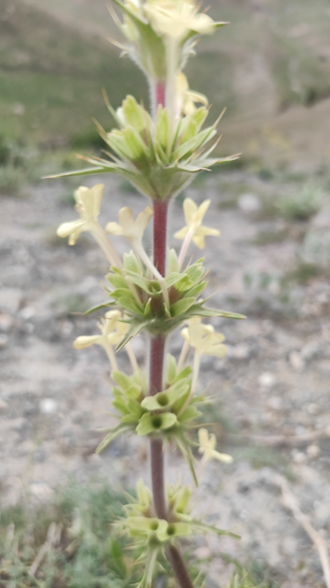 zu einem Drittel kelchförmig, an der Basis mit langen weißen Haaren bedeckt, zu zwei Dritteln in 2 kahle, lanzettliche Lappen geteilt, die kurzspaltig oder aufgeblasen; Blumenkrone blassgelb, Röhre ca. 1 mm breit, ca. 3,5 cm lang, außen weich behaart, 2-lippig, Oberlippe 2-lappig, Unterlippe 3-lappig, Lappen verkehrt eiförmig, 1 cm lang, 0,5 cm breit; 2 Staubblätter, fruchtbar, zwischen den Lappen an Ober- und Unterlippe, 2 rudimentäre sterile unter dem Schlund, zwischen