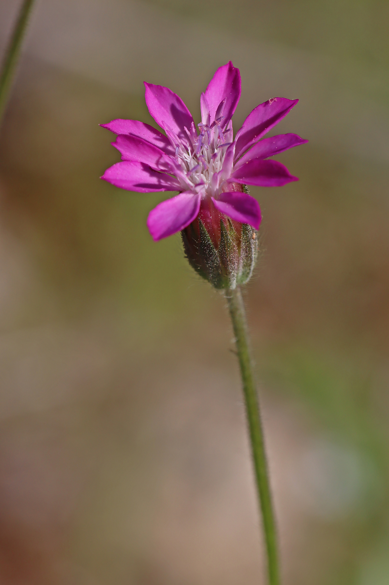 Blüte: Blüten 5-10 pro Kopf, strahlenförmig; Hüllblätter gerade-zylindrisch, 1-2 -seriatisch, 8-10, ganzrandig, einjährig; äußere 10-12 mm lang, 1-3 mm breit, zugespitzt, die inneren linealisch, vielnervig, bewimpert und drüsig, nach der Blüte zurückgebogen; Blumenkrone blutrot, äußerer Lappen breit eiförmig, größer als die anderen;