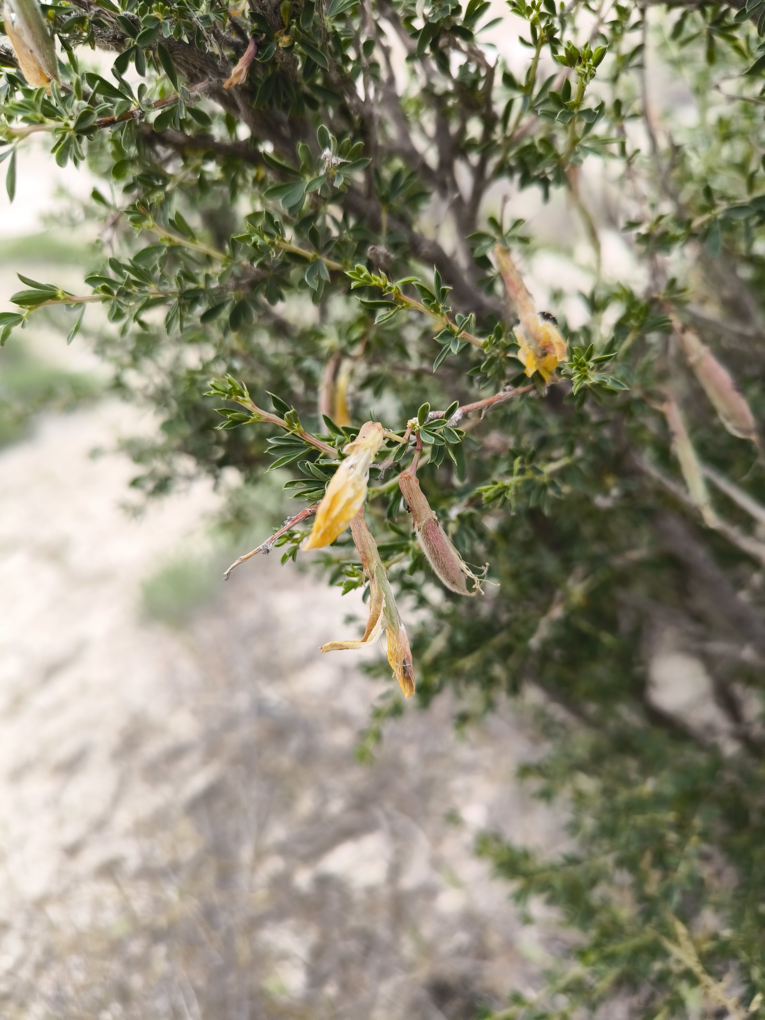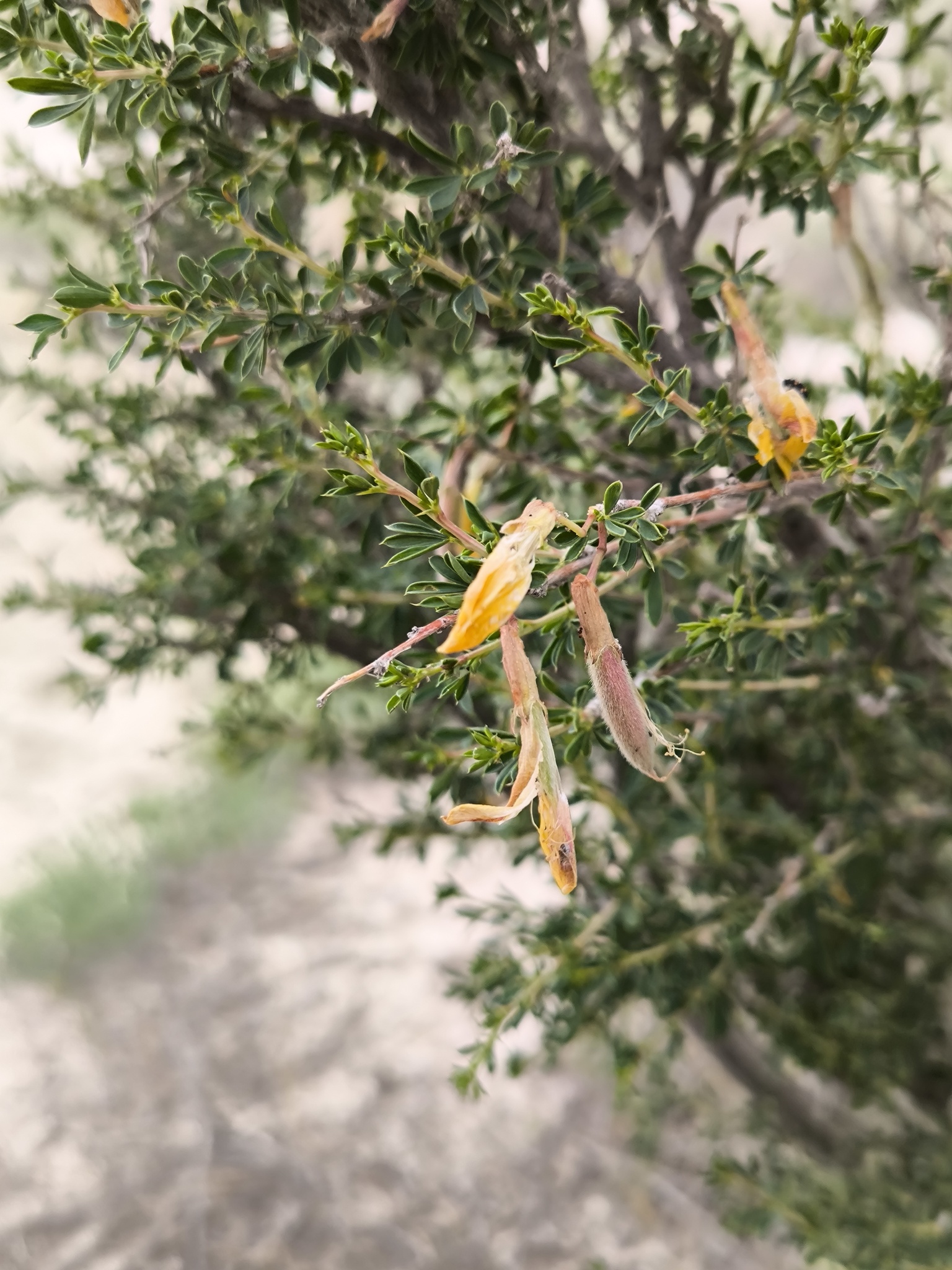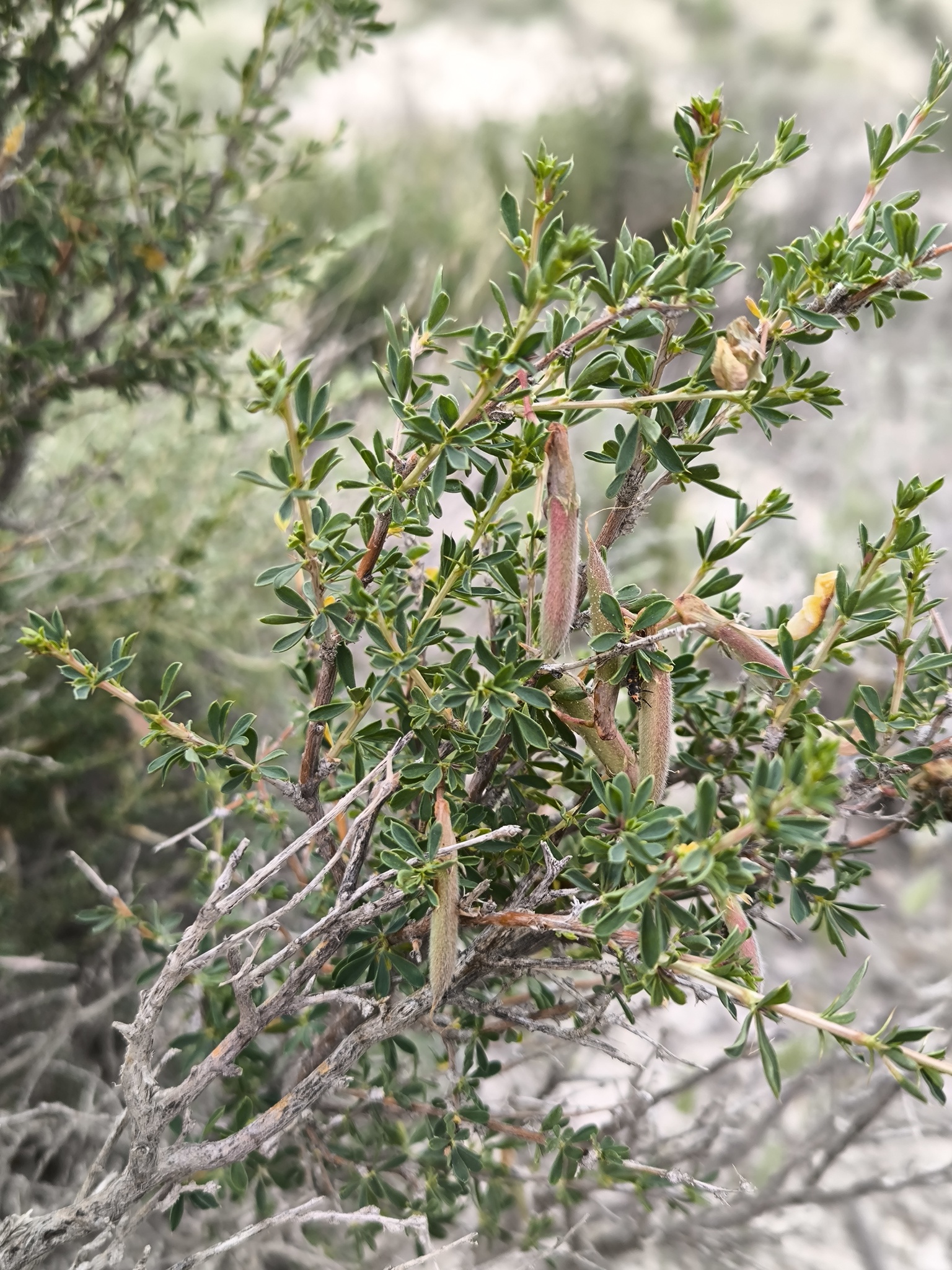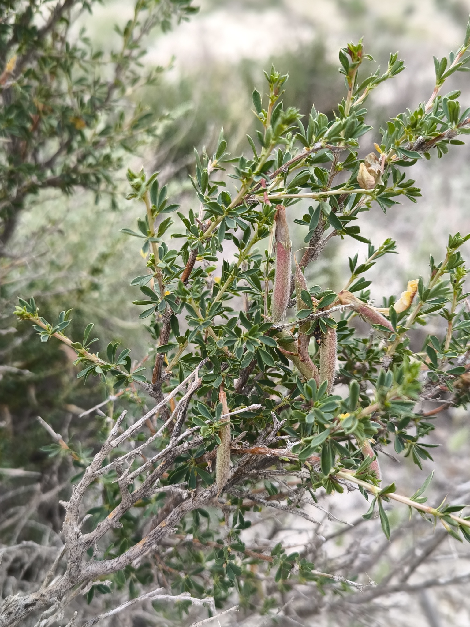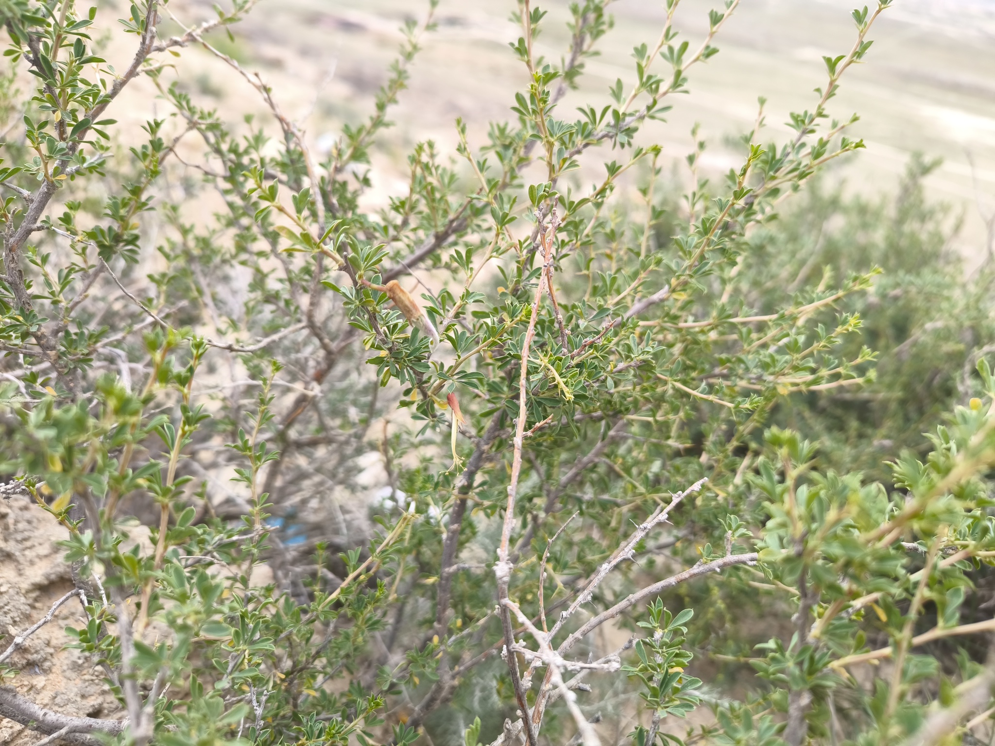 Strauch ca. 1 m hoch; junge Triebe kahl oder behaart, bis 30—40 cm lang; einjährige Triebe weißlich oder bräunlich-grau, kantig, meist mit auffälligen weißen korkigen Streifen an den Kanten; Rinde der Äste bräunlich-grau; Nebenblätter 2—3 mm lang, zu Dornen verhärtend; Blätter: Blattspreiten behaart, an langen Trieben 5—11 mm lang, in einen Dorn bis 4 mm lang auslaufend, deutlich verdickend und verhärtend, beständig (Triebe und Äste stark dornig), an kurzen Trieben kürzer, abfallend; Blättchen lanzettlich-verkehrt eiförmig oder schmal oval, an der Basis keilförmig, am Ende stumpf bis spitz, mit einem 1 mm langen Spitzchen, kahl oder anliegend behaart bis fast filzig, 4—12 mm lang und 1—3 mm breit; Blüte: Blütenstiele einzeln, kahl oder behaart, meist unterhalb der Mitte gegliedert, 5—15 mm lang; Kelch grün, unterschiedlich mit purpur-braun durchsetzt, röhrenförmig, stark bucklig an der Basis, kahl oder selten behaart, (11)12—16 mm lang; Kelchzähne 2,5—4(5) mm lang, schmal dreieckig, lang zugespitzt mit borstigem Ende; Krone 26—31 mm lang; Fahne gelb, mit der Zeit teilweise rötlich werdend, das verkehrt eiförmige bis fast breit-elliptische Flügelblatt allmählich in die Kralle übergehend und 2—3-mal so lang wie diese; Flügel mit Kralle zwei Drittel so lang wie das Flügelblatt und Öhrchen 1,5 mm lang; Schiffchen stumpf; Fruchtknoten kahl oder anliegend behaart; Frucht: Hülse linear, zugespitzt, 27—40 mm lang und 2,5—4 mm breit, kahl oder behaart. Blüte Mai; Frucht Juli.
