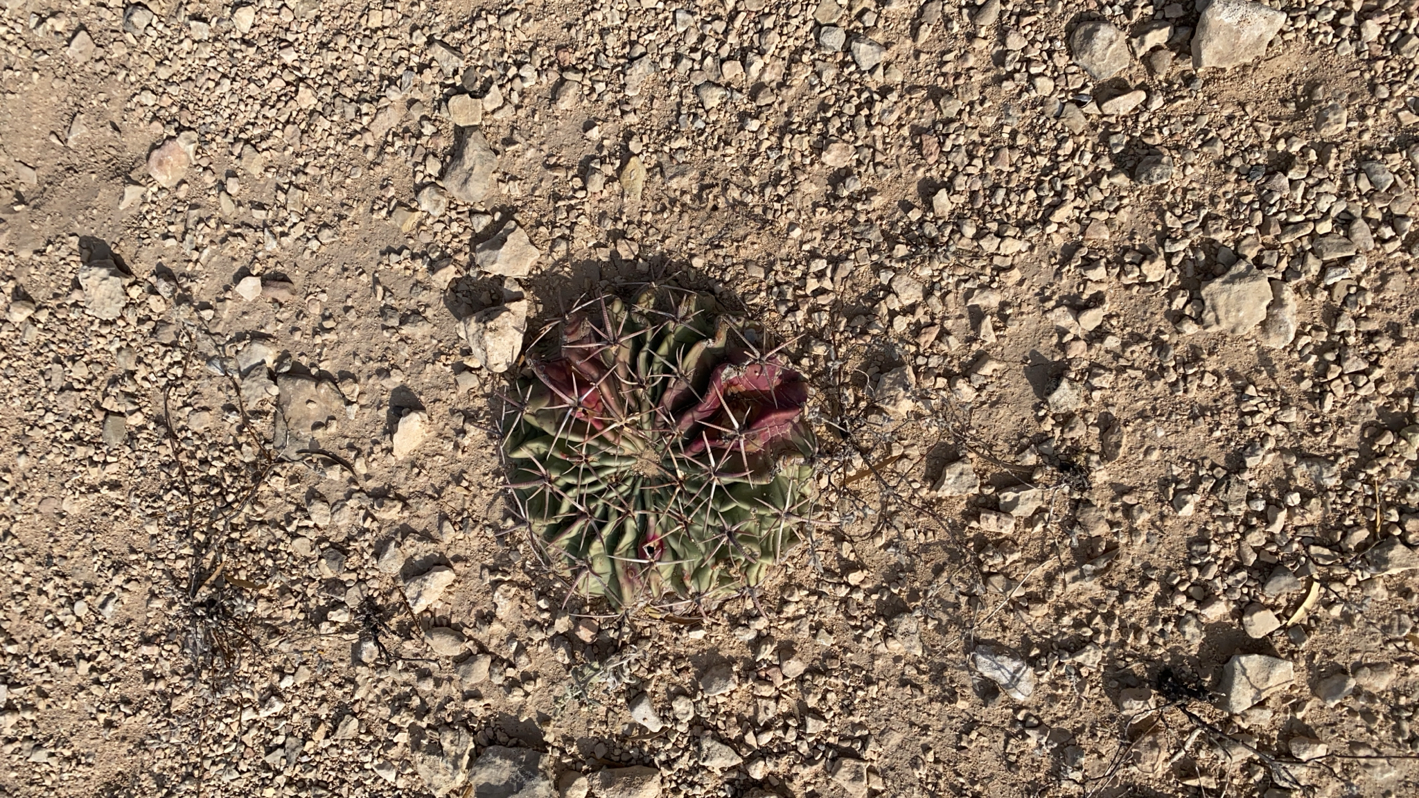 Stengel bzw. Stamm: Gewöhnlich einzeln, ± gedrückt-kugelig, bis 30 cm breit, bis 15 cm hoch; Rippen 13—27, scharfkantig; Areolen nur 2—6 auf einer Rippe, weißfilzig, groß; Randst. meist 6, selten 7, spreizend oder zurückgebogen, ± abgeflacht, ungleich, 1,2—4 cm lang, selten bis 5 cm lang, rötlich, zumindest anfangs, dann auch gelb werdend, randständige breitpfriemlich, geringelt; Mittelstachel 1 am breitesten, ± flach, abwärts gerichtet, leicht nach unten gebogen, bis 6,5 cm lang und bis 8 mm breit, stärker geringelt