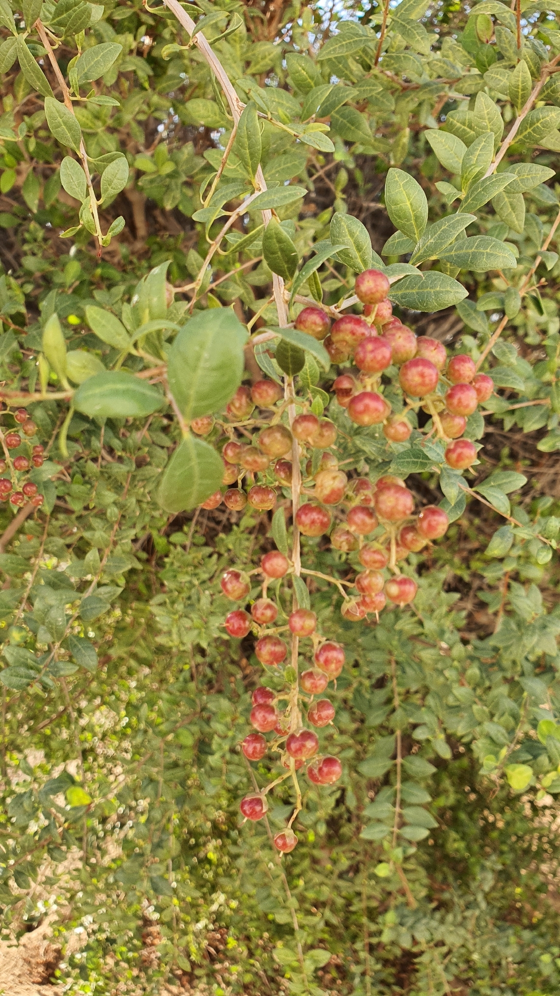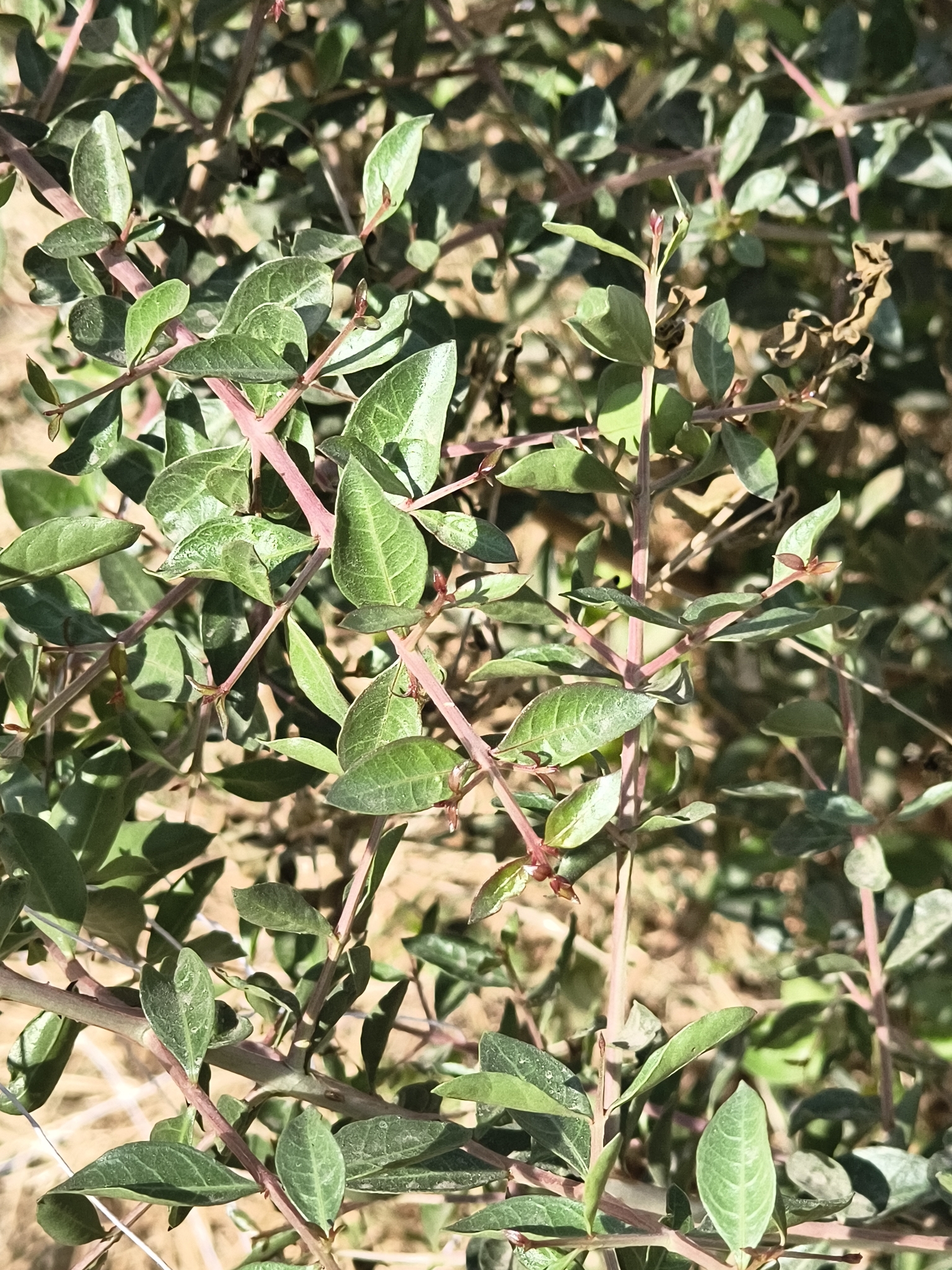 Blätter kleinund oval, etwa 2-3 cm, gegenständig, oft an kurzen, dornigen Zweigen.