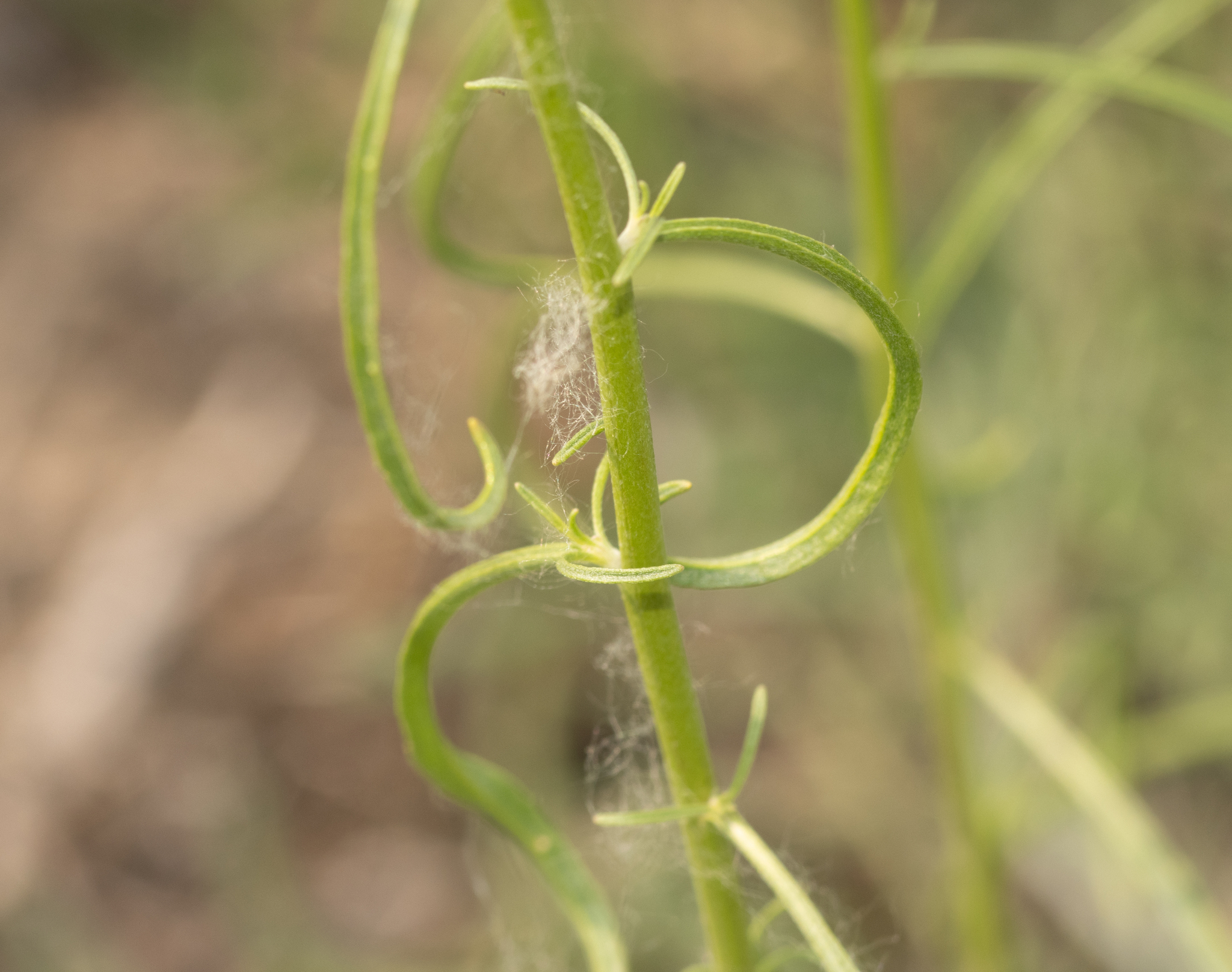 Blatt: Blätter sehr schmal, entfernt stehend, ganzrandig, spitz, in ihren Achseln kleine, unfruchtbare Zweige (Blattbüschel) treibend, durch angedrückte, steife Haare etwas graugrün.